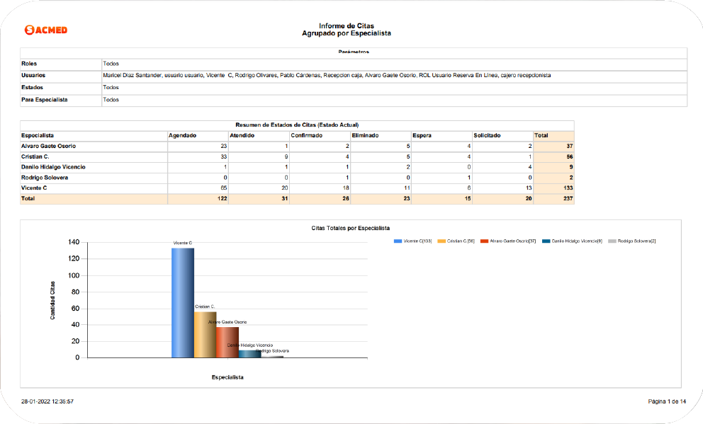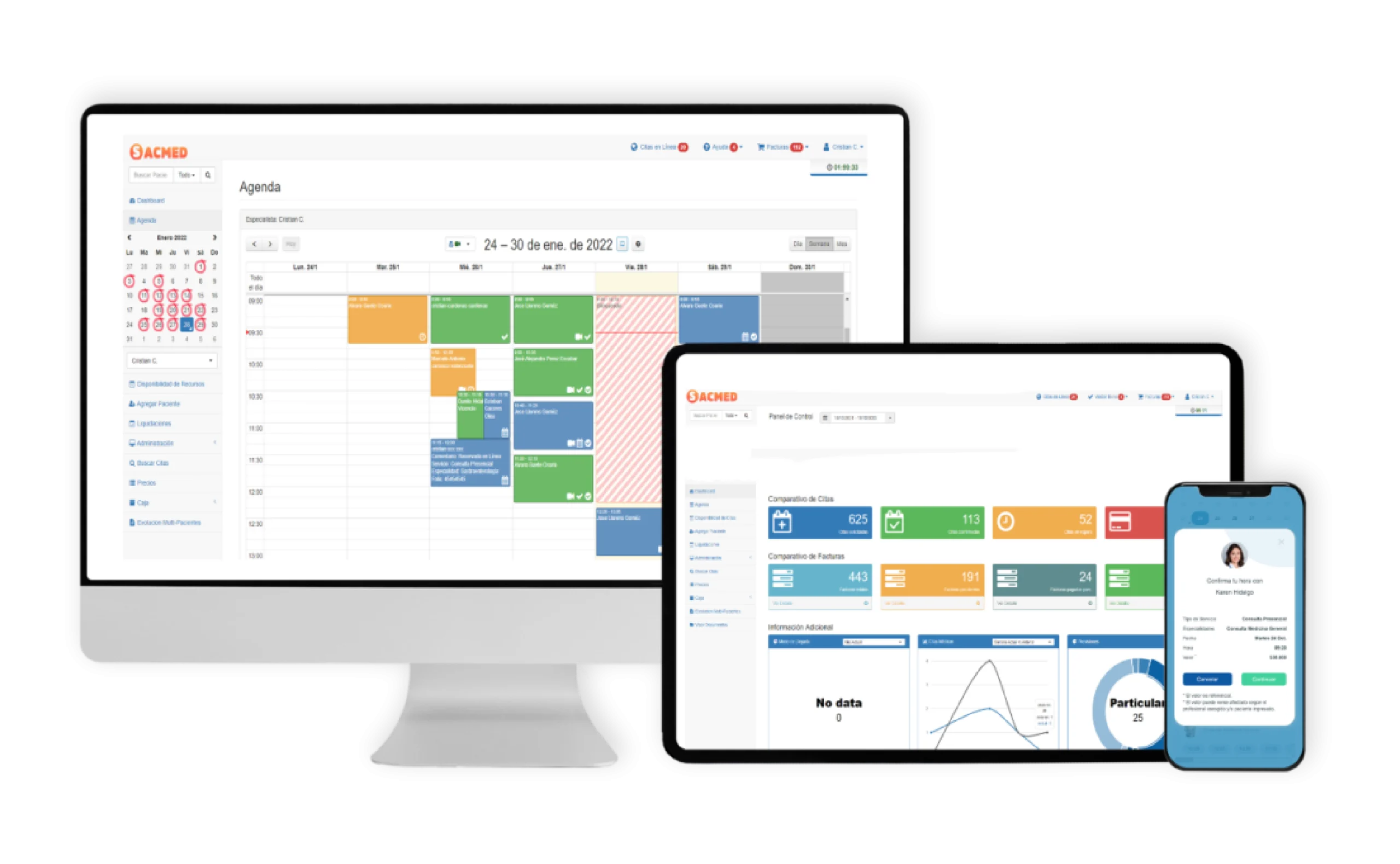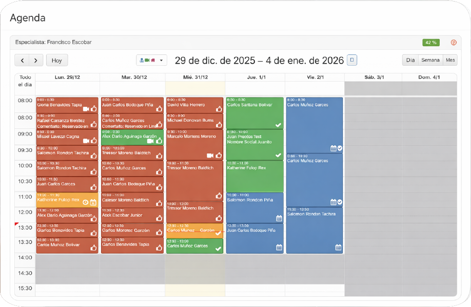 Una agenda muy versátil y orientada en la usabilidad que le permitirá registrar citas médicas por cada especialista, bloquear horas, cambiar los estados de atención, buscar citas médicas de pacientes y en distintos tipos de vistas (diarias, semanales y mensuales).