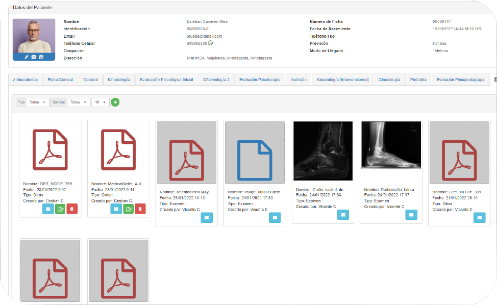 Ficha clínica que cumple con la normativa vigente Chilena. A través de ella podrá registrar todas las atenciones de sus pacientes, incorporando exámenes, imágenes o cualquier documento que estime relevante en la atención de salud.